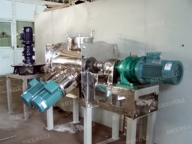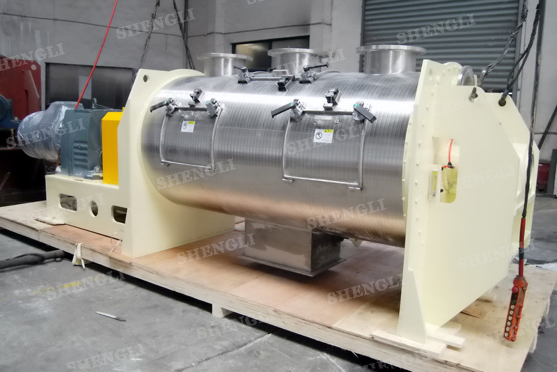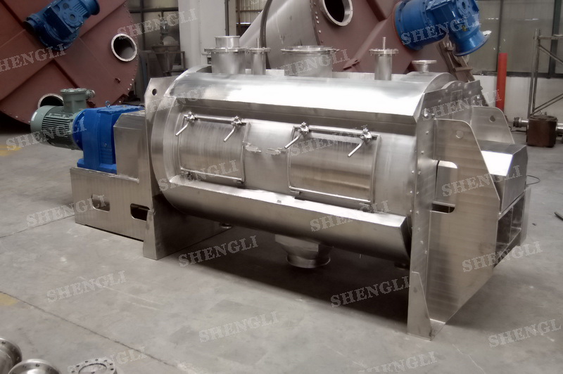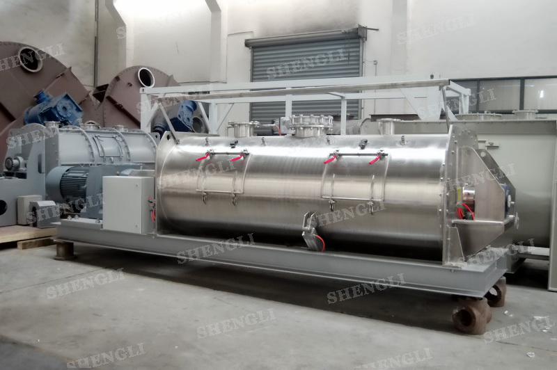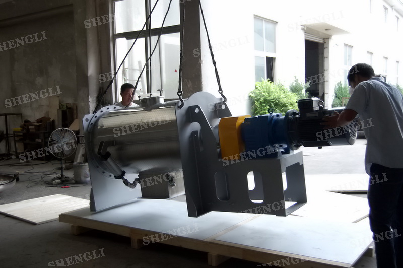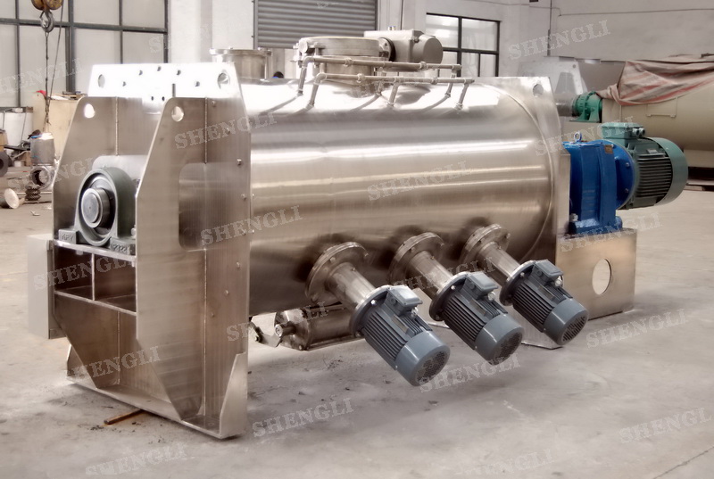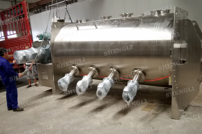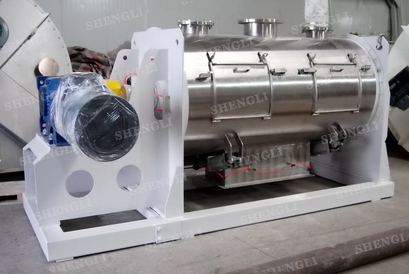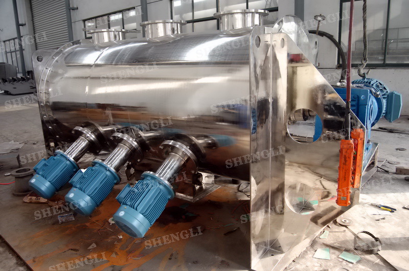 描述:犁刀混合機采用臥式圓柱筒體,內設平行主軸,主軸上安裝若干犁式刀頭,通過較快的旋轉速度,分割、重合物料,實現快速攪拌的功能,常結合1500-3000轉高速剪切飛刀相互作用。