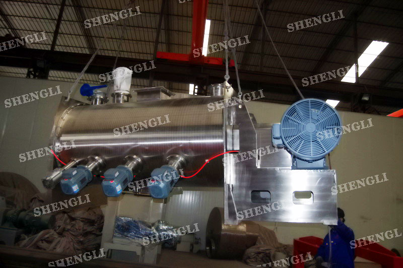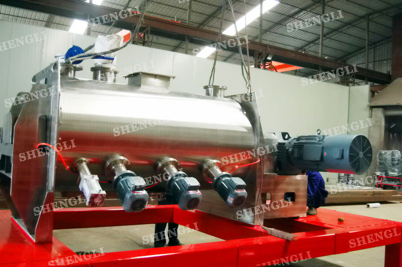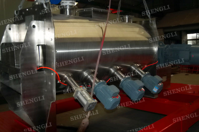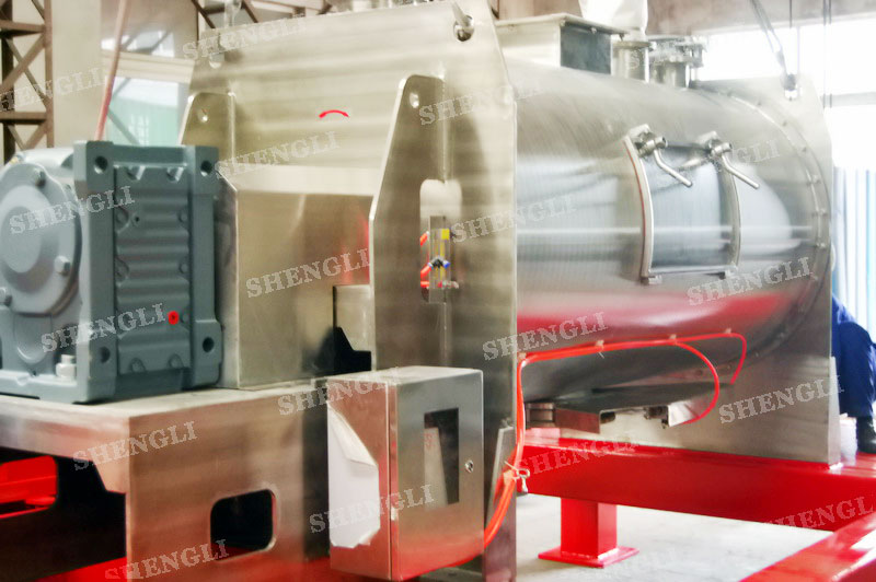 工作原理:犁刀式混料機采用臥式圓柱筒體,內設平行主軸,主軸上安裝若干犁式刀頭,通過較快的旋轉速度,分割、重合物料,實現快速攪拌的功能,常結合1500-3000轉高速剪切飛刀相互作用。