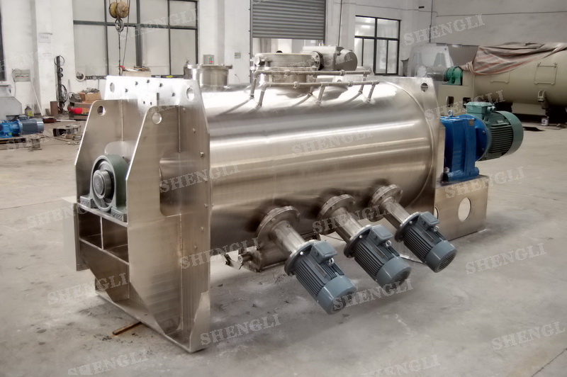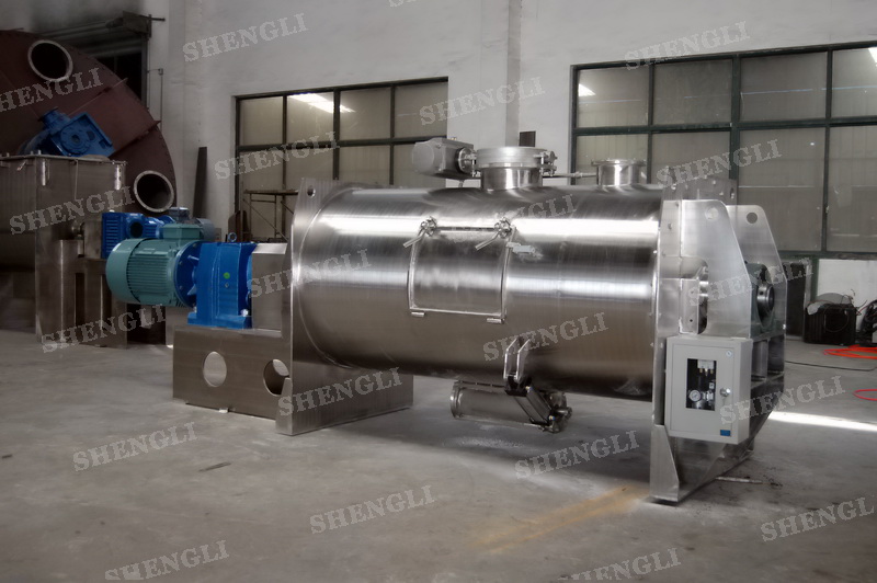 工作原理:犁刀混料機采用臥式圓柱筒體,內設平行主軸,主軸上安裝若干犁式刀頭,通過較快的旋轉速度,分割、重合物料,實現快速攪拌的功能,常結合1500-3000轉高速剪切飛刀相互作用。