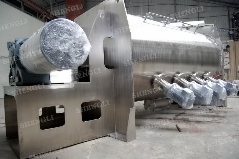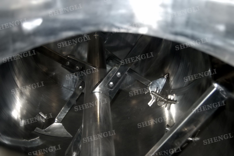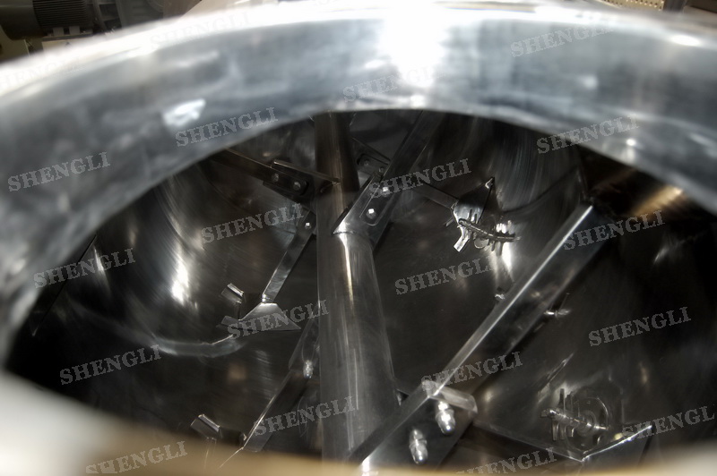 工作原理:犁刀式攪拌機采用臥式圓柱筒體,內設平行主軸,主軸上安裝若干犁式刀頭,通過較快的旋轉速度,分割、重合物料,實現快速攪拌的功能,常結合1500-3000轉高速剪切飛刀相互作用。