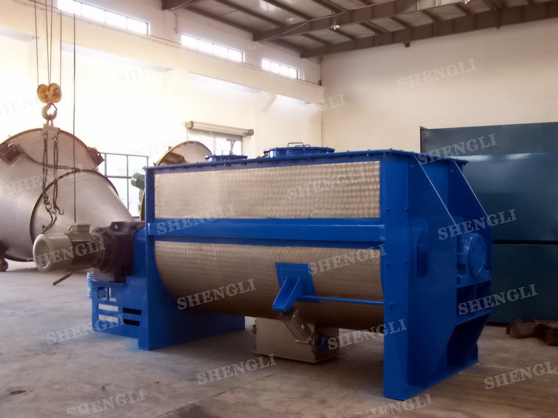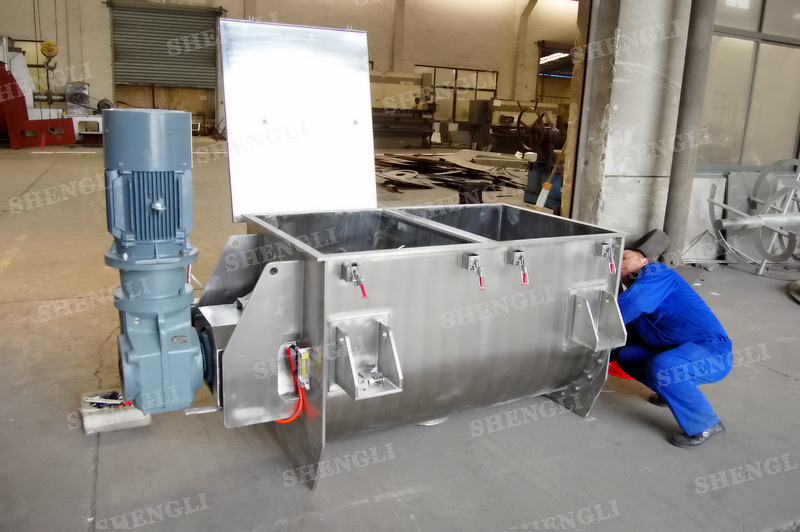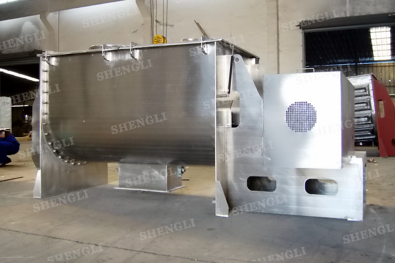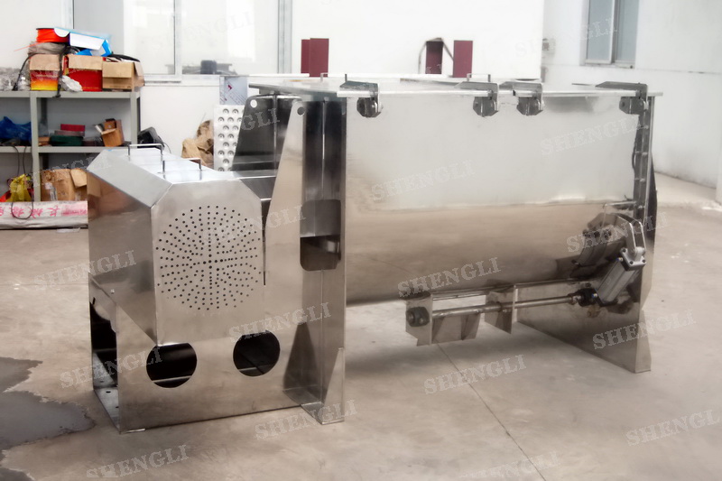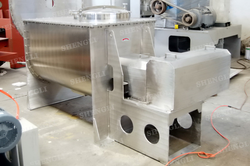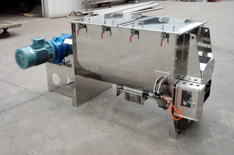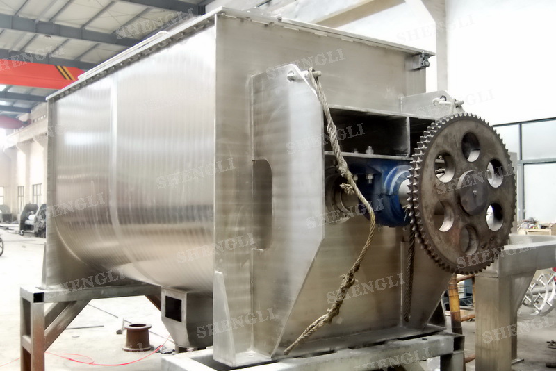 工作原理:螺帶混合機采用U型筒體,內裝平行主軸,主軸上安裝正反雙向的盤條螺帶,不同維度螺帶分內螺帶與外螺帶,物料在螺帶的驅使下反復參混,能夠快速高效的混合。
