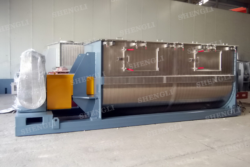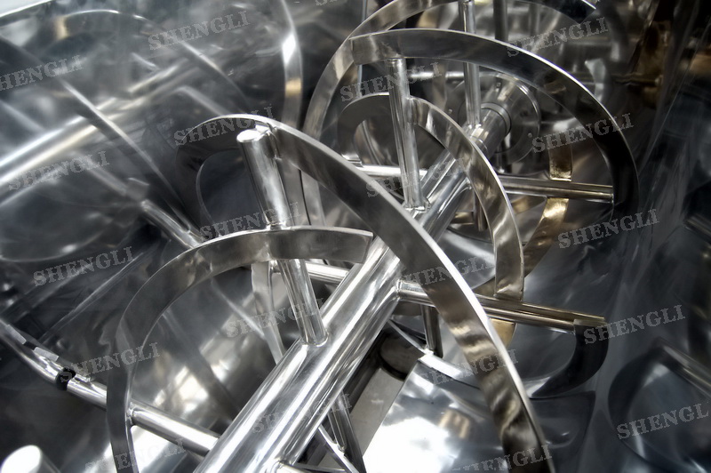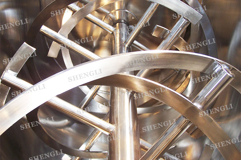 工作原理:螺帶臥式混合機采用U型筒體,內裝平行主軸,主軸上安裝正反雙向的盤條螺帶,不同維度螺帶分內螺帶與外螺帶,物料在螺帶的驅使下反復參混,能夠快速高效的混合。