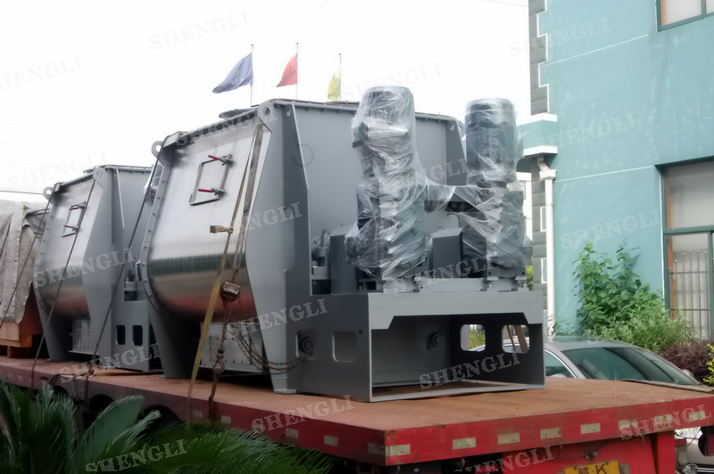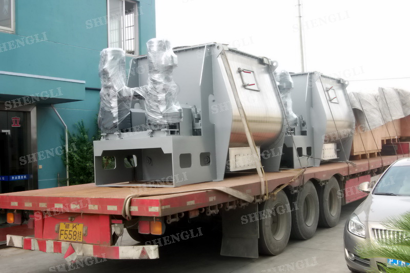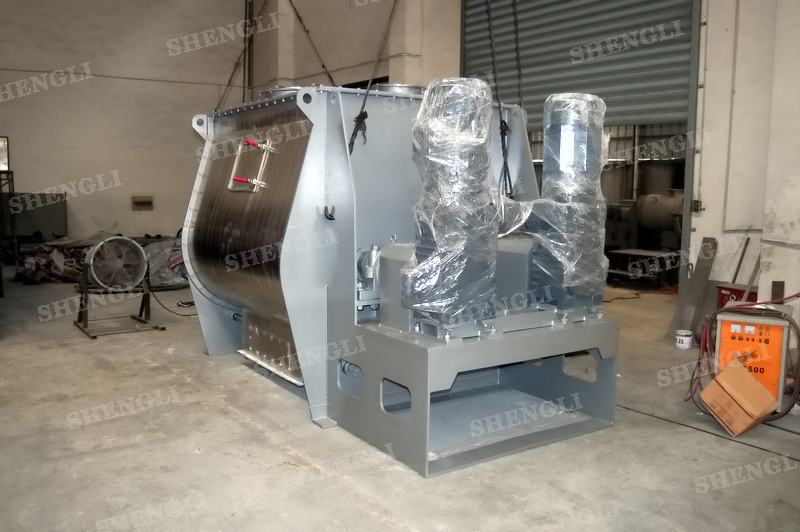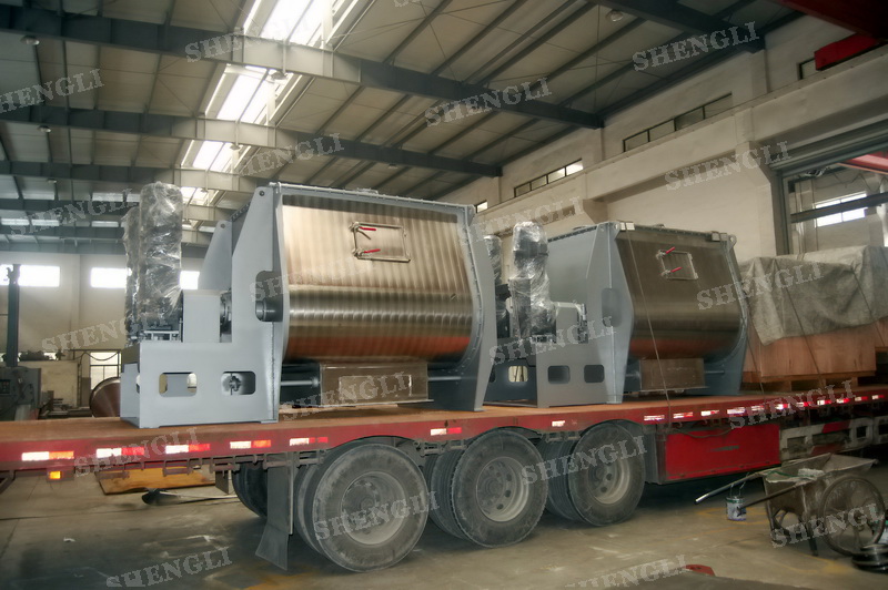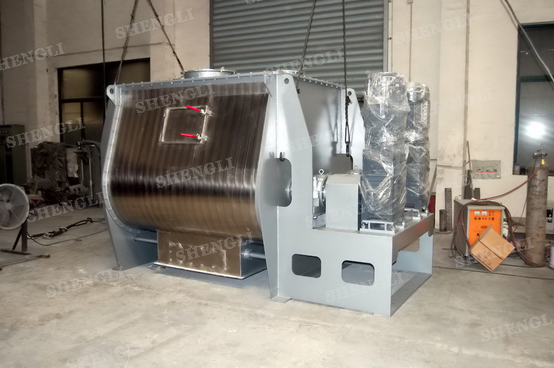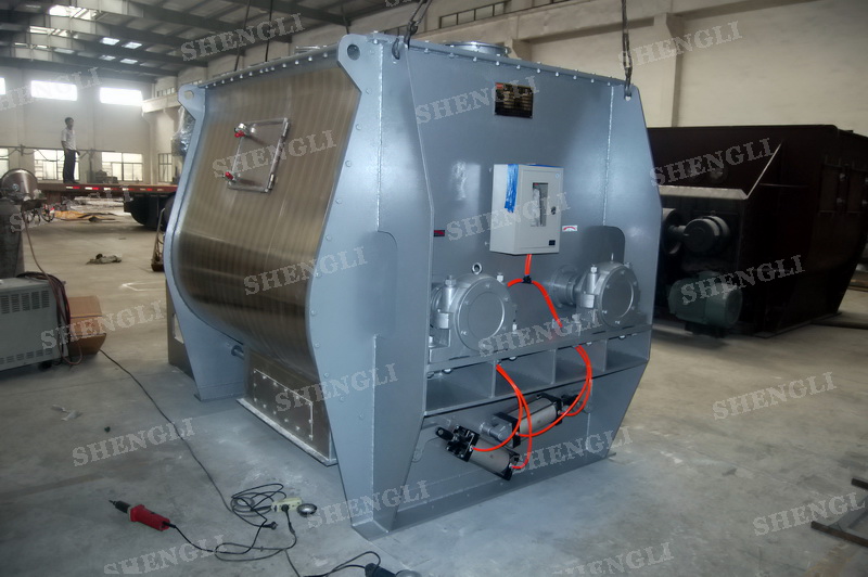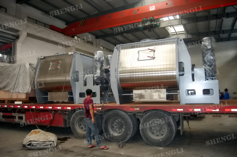 工作原理:臥式干粉攪拌機采用雙U型筒體,內裝平行的雙主軸,主軸設有對稱的多組槳葉,其雙軸的運行軌跡部分重合形成嚙合空間,雙軸在受雙電機同步驅動,同步的對稱向外翻攪物料,致使物料能夠達到瞬間失重點,該設備具備高效物料無差別的混合能力。
